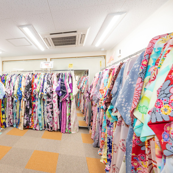 With a total floor space of over 1,000 tsubo (approx. 3,300 square meters), Yumeyakata is one of the largest kimono rental stores in Kyoto. Our facilities include a waiting area on the first floor, an in-house studio, and dedicated dressing spaces for large groups.