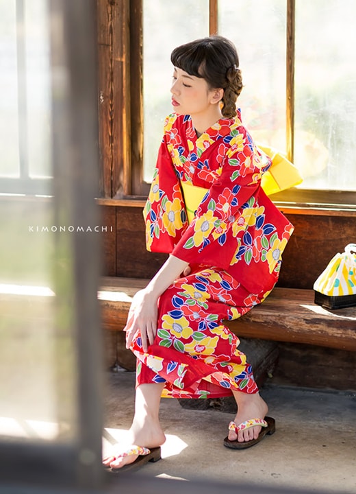 太陽の光のもとでいっそう明るく映えるキレイな紅赤色の浴衣。赤と黄色で縦に連なるように描かれた、レトロなタッチの「紅型」風の椿の花がとってもカラフル。葉っぱの紺色と緑色もキレイな差し色に。明るい黄色の兵児帯との相性バツグン!