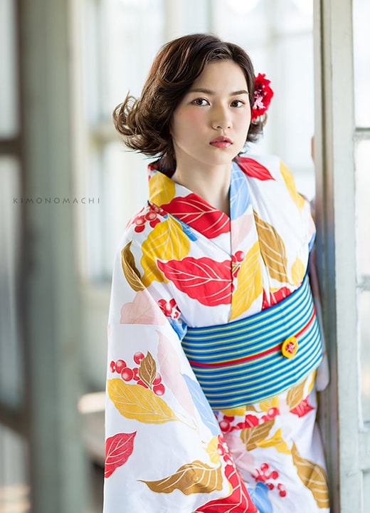 白地に、大きく描かれた葉っぱと木の実。赤、黄、水色に黄土色の色とりどりの葉に、赤い木の実がアクセントに。オシャレな雰囲気の1枚を探しているなら、こんな色柄にこだわってみては?濃淡のブルーとイエローの縞模様が爽やかな半幅帯を合わせました。