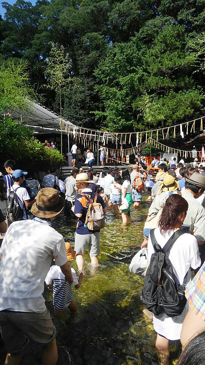 Amid this hot weather, Ashitsuke-shinji (足つけ神事), an annual event of Shimogao shrine (下賀茂神社), was conducted. The event is held around Doyo no ushi no hi (土用の丑の日, dog days of summer) every year, and the shrine becomes very crowded with visitors purifying their body and soul by soaking their feet in the Mitarashi pond (御手洗池) on the premises. They are all somewhat complaining about the weather in a good animated way, and still eager to make wishes.