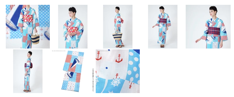今年は浴衣でマリンルックに挑戦! スカイブルー地に白の水玉模様や、赤×白のウェービーな縞模様、ブルーのヨットのイラストが一面に。パッチワークのようなにぎやかなデザインを活かしたいから、帯も派手めのものをチョイスして。